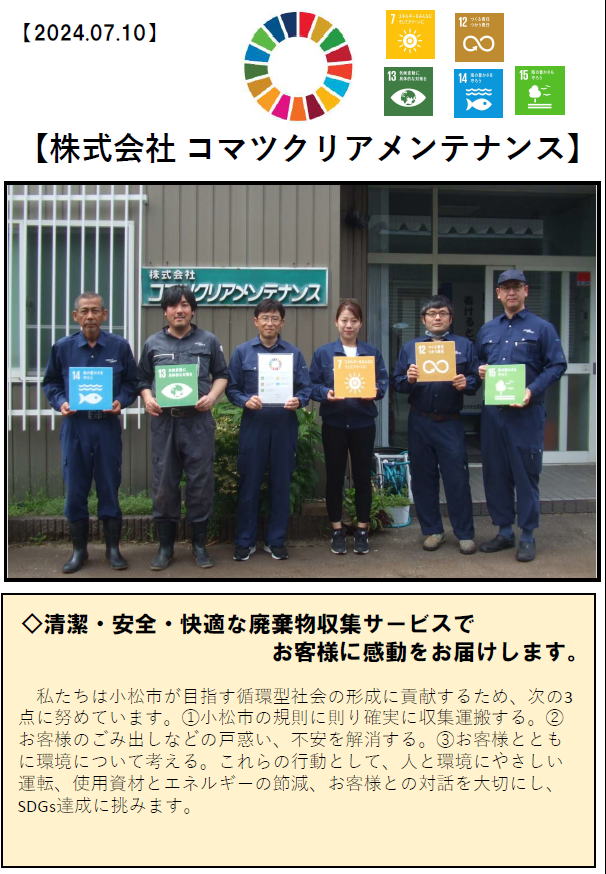 小松市のホームページ内の「SDGs宣言しませんか?」のページにてSDGs宣言 いたしました。 社員一同、目標達成に向けてがんばります。